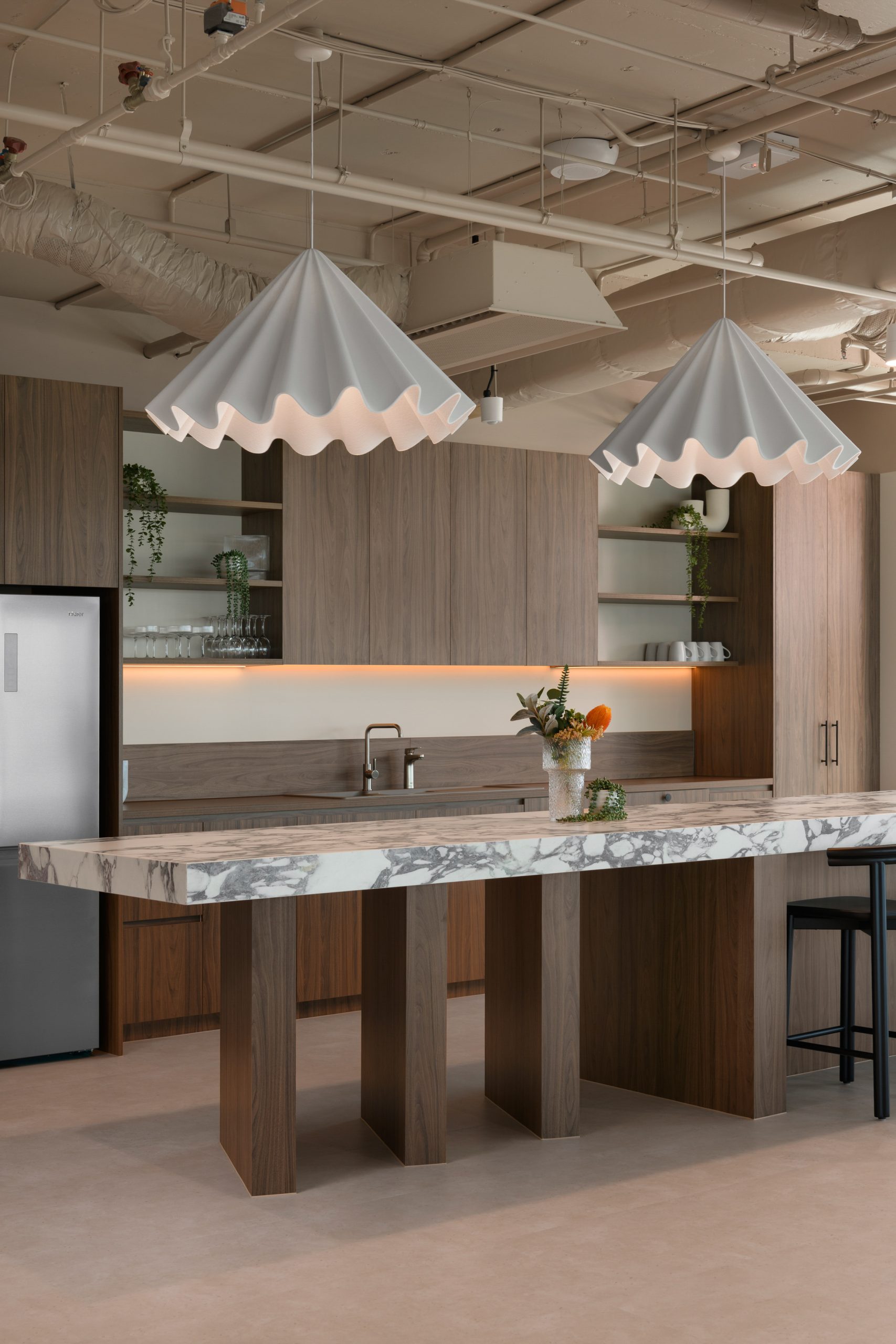 A continuous planning spine runs through both levels, linking receptions, kitchens, meeting rooms and breakout spaces so that movement, collaboration and amenity feel intuitive and legible for tenants and visitors.