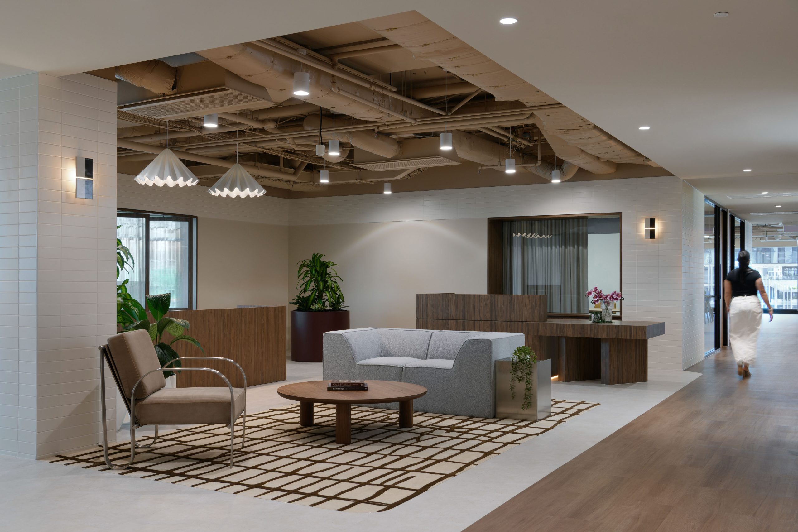 The concept, Axis, takes its cue from James Street as the cultural backbone of Fortitude Valley and from the idea of an imaginary line around which activity turns. A central activity spine organises the floors, anchoring receptions, kitchens, collaborative hubs, and shared amenities, while quieter zones sit at the perimeter. Materials feature warm walnut, refined stone, soft upholstery and considered lighting to create a classic, enduring sense of luxe.